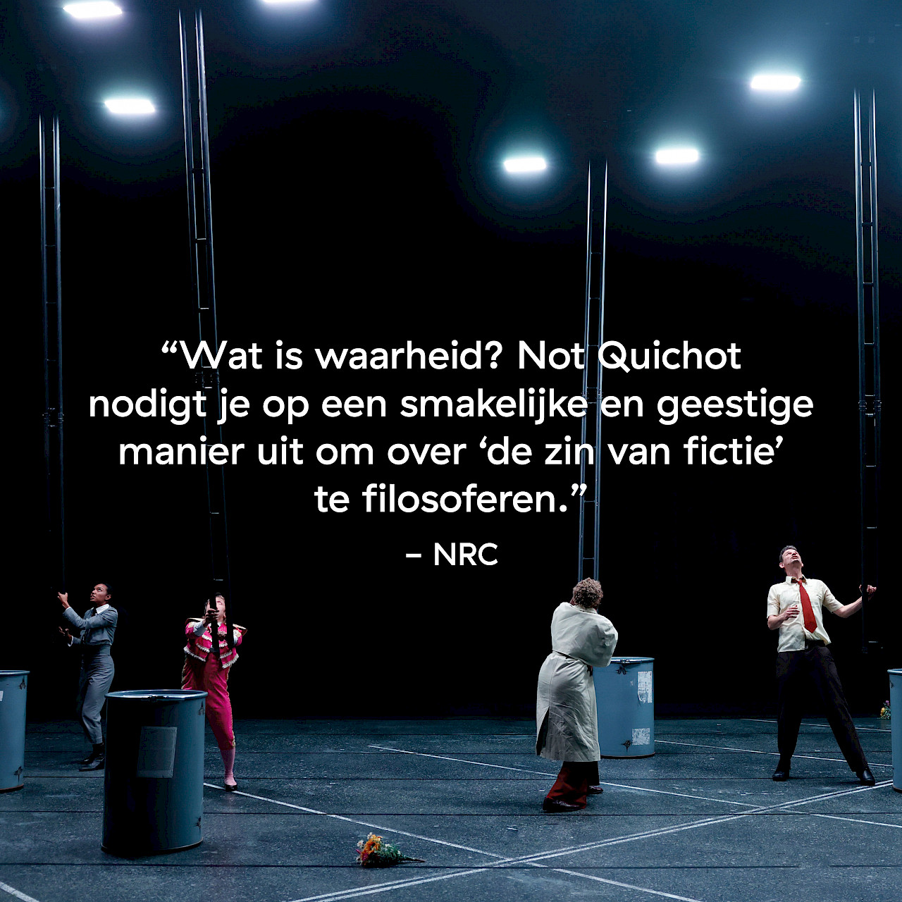 Iedereen wordt gek in deze wereld. Jawel, jij ook. Niemand weet nog wat echt is en wat fictie. Overleven is eerder een gelukkig toeval, dan het resultaat van weloverwogen handelen. We zijn dus allemaal de dwaze held met de goede bedoelingen Don Quichot. Or not? Hoeveel waanzin kan je in één voorstelling verteld krijgen? Hoeveel onwaarschijnlijke events kan je rechtbreien in je eigen hoofd? In Not Quichot herdenken zes vertellers hun goede vriend Q, maar wie was Q’s béste vriend? Door middel van straffe verhalen nemen ze je mee op hun avonturen met Q door heel en half Europa, door bergen, bossen, langs boerenprotesten en brandende bibliotheken. Geen ander duo dan schrijver Joachim Robbrecht en regisseur Sarah Moeremans kan zo classy een klassieker als Don Quichot tegen de muur aanrijden om de sterkste elementen tussen de brokstukken vandaan te halen.