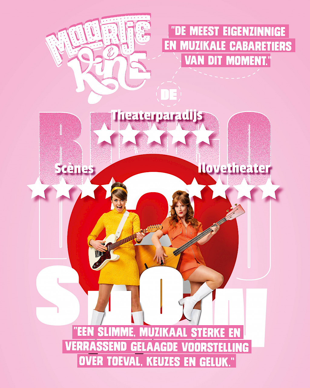 Het leven is een loterij, je kan geluksnummers trekken of het ongeluk treffen - en niemand die het van tevoren weet. De Bingo Show is een loterij en theatershow-in-één. Twee voor de prijs van één, dus! In deze voorstelling zijn Maartje en Kine eerlijker, genadelozer en grappiger dan ooit. Hun twintiger jaren zijn alweer even voorbij, niet alle nummers van de bingokaart liggen nog open. Puttend uit eigen levenservaring, toekomst- en angstdromen bezingen ze hartstochtelijk de tragikomische kanten van het leven: een vader die vergeet dat ie Alzheimer heeft, de liefde van je leven die gelukkig is met een ander, je veel-te-late wraakfantasie over die pester van de lagere school.